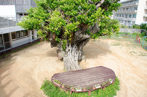 ゴスペル幼稚園の園庭にあるガジュマルの木は、1950年の創設以来、園のシンボルとして長年にわたり園児や地域の人々を見守ってきました。2011年の台風で倒木しましたが、多くの人々の支えによりその後も園庭の中心に残り続け、子どもたちの遊び場や憩いの場として存在し続けました。